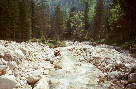 Ein glasklarer Bergbach. Zur Schneeschmelze ist in diesem Tal sicher richtig “Stimmung”, wie die teilweise riesigen Gesteinsbrocken vermuten lassen.
