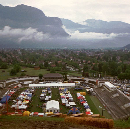 Ein Blick auf das Stadion von Garmisch. Wir stehen hier direkt vor dem Schanzentisch. Der Eingeweihte erkennt bei den Strohballen auch die Rampen für den Biker X Contest.